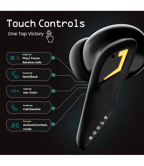 Elevate your gaming experience with Boult Astra earbuds. Dominate the gameverse with 48 hours of playtime and 120 hours of standby, ensuring uninterrupted gaming sessions. Enjoy Lightning Boult type C fast charging, where just 10 minutes of charging fuels 100 minutes of playtime. Communicate seamlessly with ZEN quad mic ENC, enhancing call clarity. Activate Combat gaming mode with 40ms ultra low latency, achieving seamless and responsive gameplay. The breathing LED feature adds a dynamic visual element that syncs with your every move. Express your style with classy color variants like Black Gloss, White Opal, and Smoky Metal. Experience swift pairing through Blink & Pair and Bluetooth 5.3 technology, ensuring you're always ready for action. The innovative BoomX Technology and 13mm drivers deliver a powerful, supreme bass, immersing you in the audio. Navigate effortlessly with touch controls, and access the voice assistant for convenient commands. The IPX5 water resistance provides durability, allowing you to game confidently in any environment. Dominate the competition and embrace victory with Boult Astra earbuds, your ultimate gaming companion.