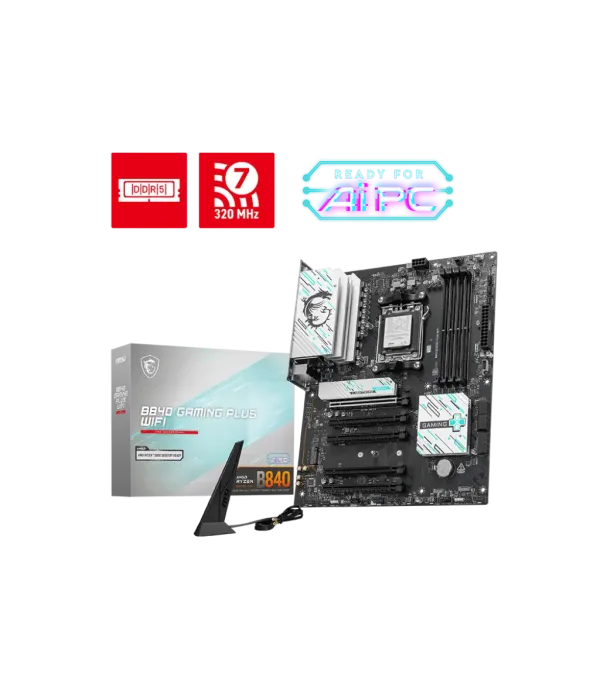 The B840 GAMING PLUS WIFI is crafted to offer extensive connectivity, versatile tools, and a premium Wi-Fi solution for gamers seeking a comprehensive experience. Featuring full-speed Wi-Fi 7, 2.5G LAN, PCIe 4.0 solution, and exclusive EZ DIY features, it is ready for 24/7 non-stop gaming optimized for AMD Ryzen™ 9000 series processors.