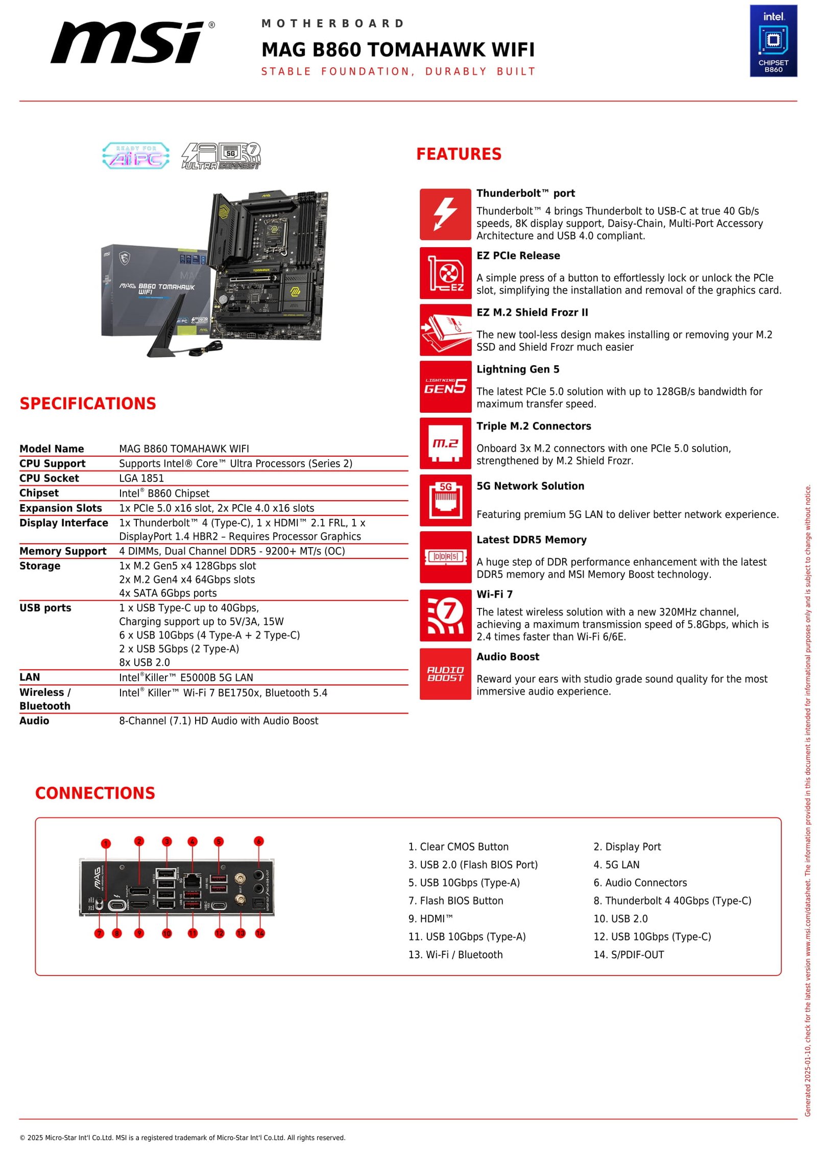MAG B860 TOMAHAWK WIFI is designed for gamers with a stable, durable and DIY friendly foundation for their PC builds. Coming up with Killer Wi-Fi 7 solution and 5G LAN, Thunderbolt 4, PCIe 5.0 solutions, Supplemental PCIe Power and exclusive EZ DIY features, it's ready for the battlefield of Intel Core Ultra processors.