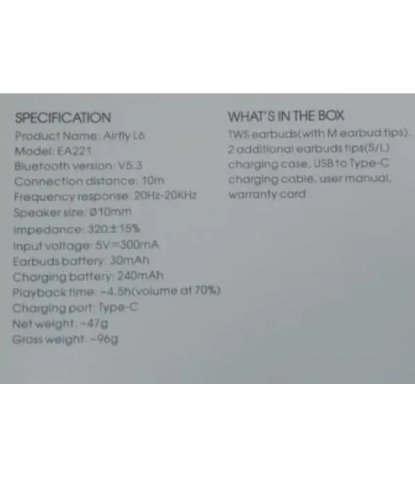 Ideal for listening to music, internet radio, or making voice calls while working, walking, training, or driving, the AirFly L6 earphones are compatible with most Bluetooth-enabled devices, including smartphones, computers, notebooks, and tablets. They support both Android and iOS devices. The built-in microphone allows for hands-free calls, and with a full charge, you can enjoy approximately 300 minutes of music or talk time, thanks to the energy-efficient Bluetooth 5.3 technology.
