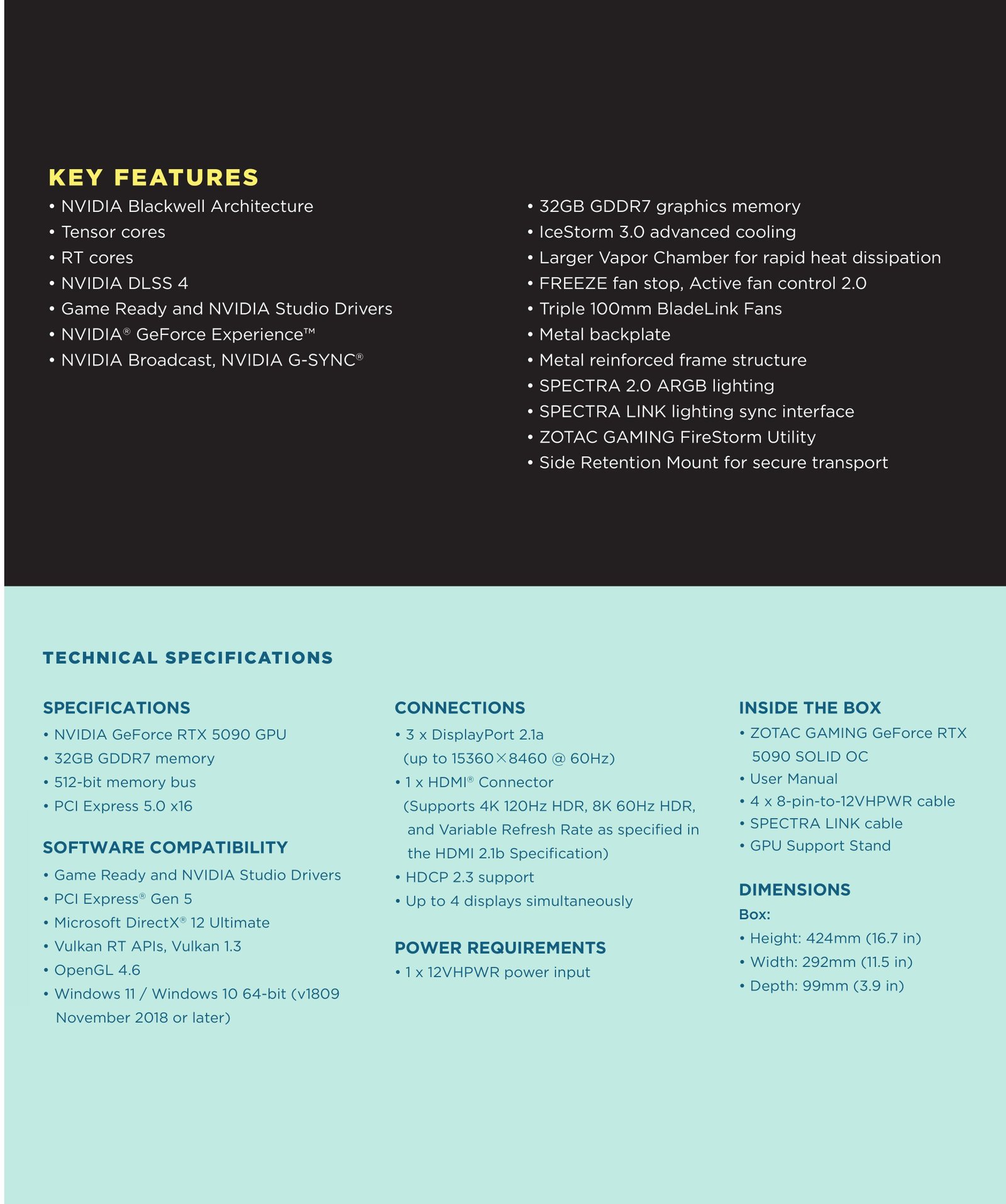 - NVIDIA GeForce RTX™ 5090 Feature Highlights: Powered by the NVIDIA Blackwell arc..